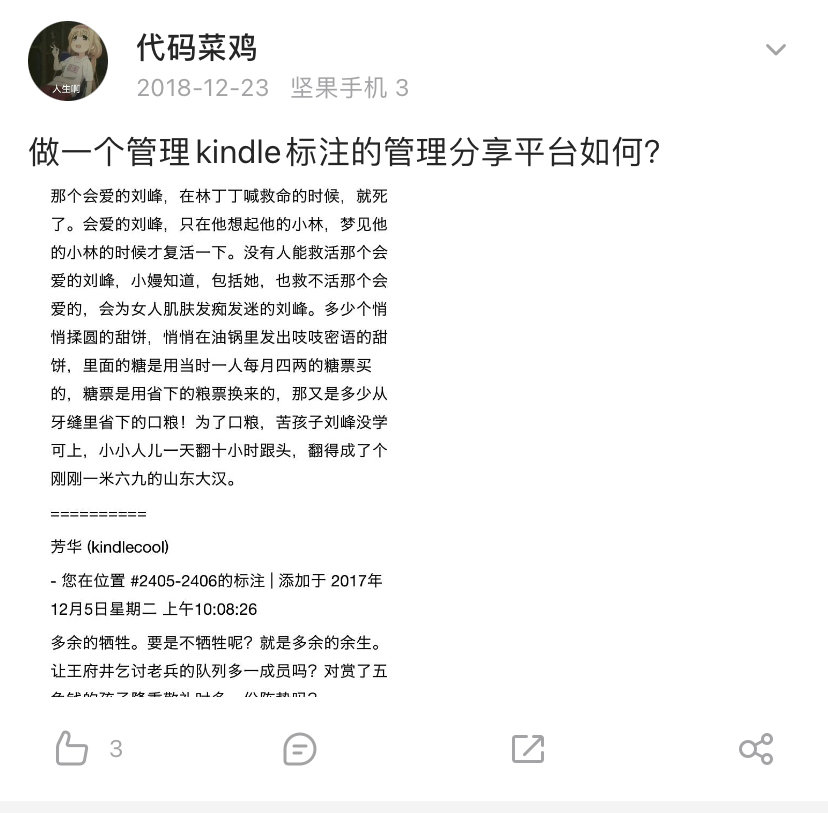 开发 纸间书摘 的想法源自于 2018 年购买 Kindle 一个月后,我看书很喜欢做笔记,划下自己喜欢的句子,记录下当时的想法。每次用 Kindle 进行笔记回顾时,过程都异常痛苦,水墨屏的刷新率直接降低了操作时的效率,并且 Kindle 提供的功能也弱到仅能查看而已。当时也尝试过一些市面上比较流行的书摘应用,如阅读记录、滴墨书摘等,它们都是很优秀的产品。但在使用这些产品时都为没发完全掌控自己的数据而感到不安,担心服务商跑路我要面临数据丢失和切换平台的风险。