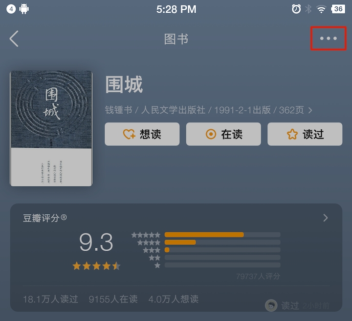 1. 在豆瓣的图书详情页面点击右上角更多按钮。