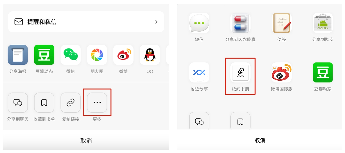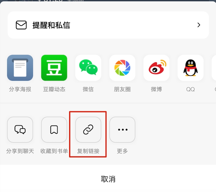 3. 在按步骤 2 操作时,如果点击更多按钮后没有在弹出的可分享应用列表中看到纸间书摘,你可以点击复制链接,然后返回纸间书摘,此时应用会自动开始解析链接对应的书籍信息。