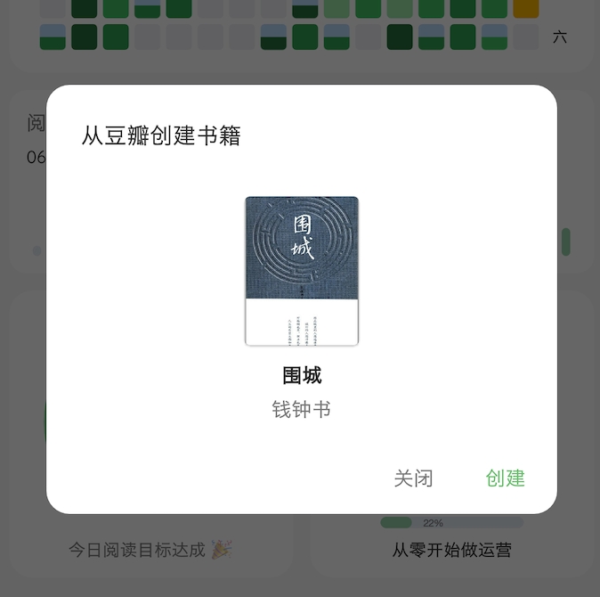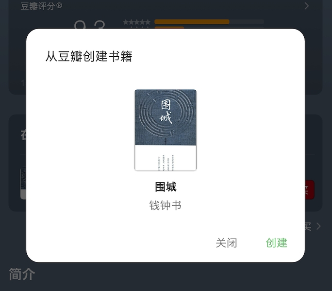 若书籍解析成功,你将会看到从豆瓣创建书籍的弹窗,点击创建即可。