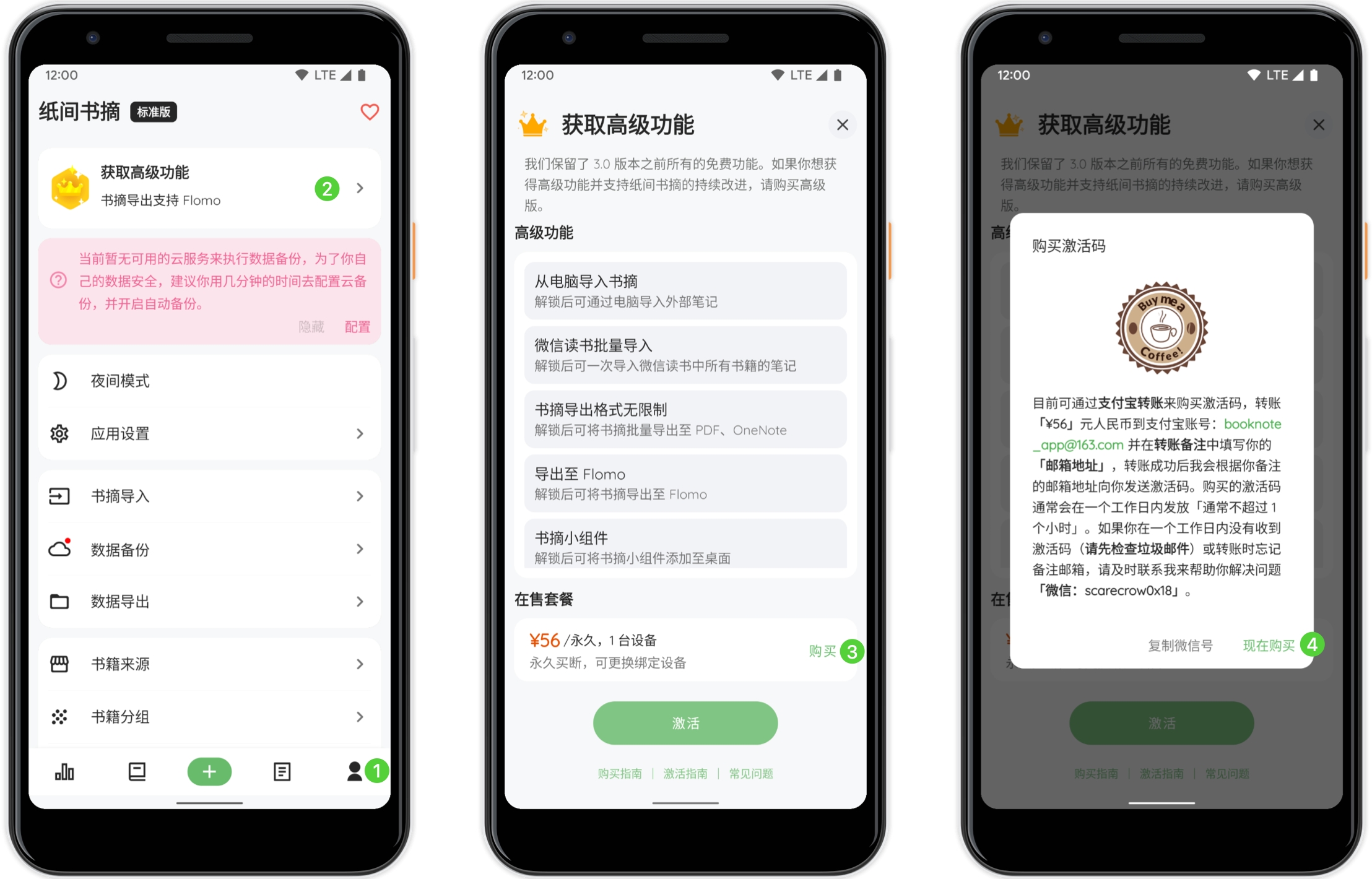由于应用内没有接入三方支付, 目前还无法在点击现在购买后直接唤起微信或支付宝来完成您的购买。目前我们采用在应用外通过支付宝手动转账并配合人工审核账单的方式来完成您的购买,我们会在一个工作日内送出您的激活码。
