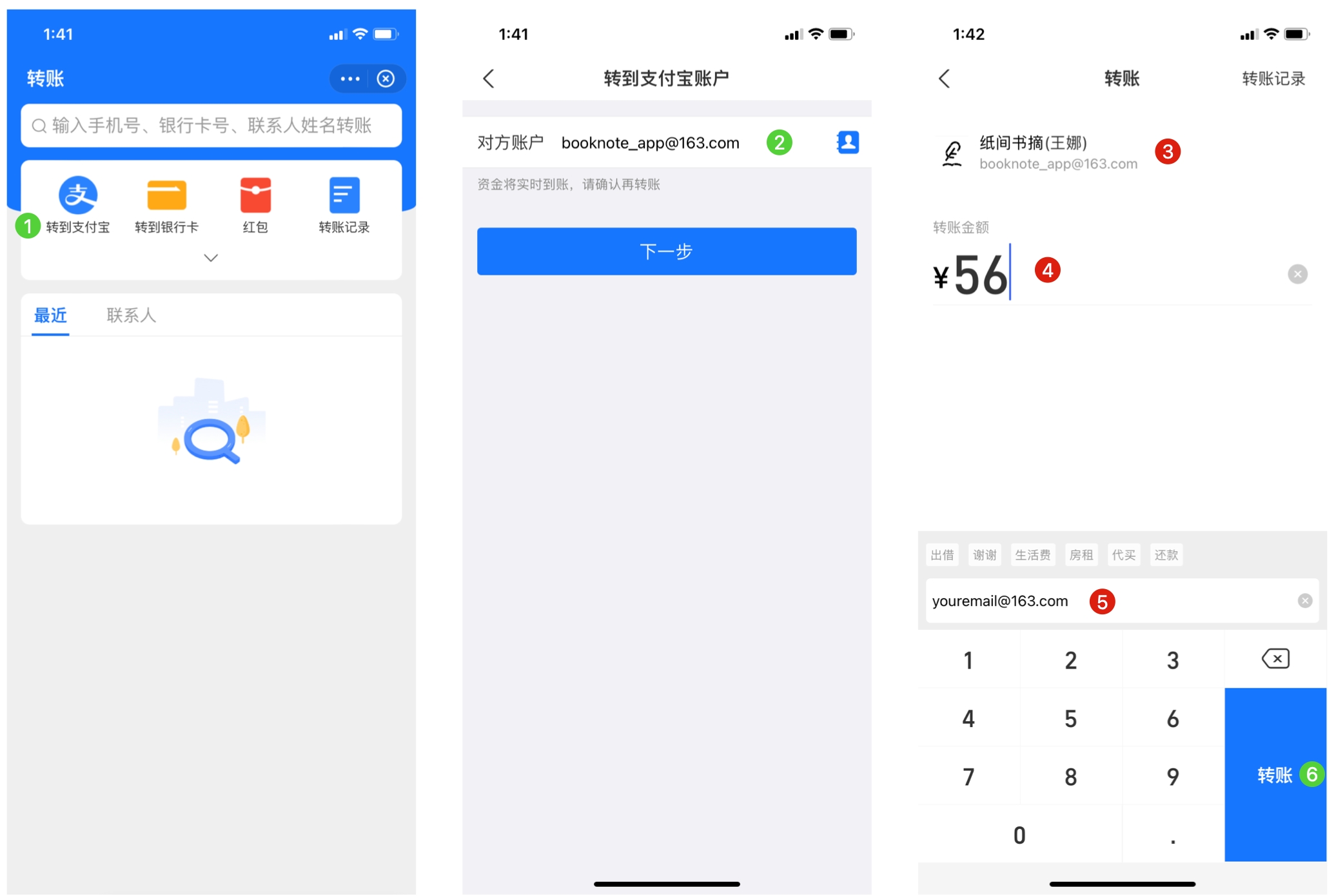 请核实账户名称无误后再进行转账,我们的收款账户名称为:纸间书摘(王娜)