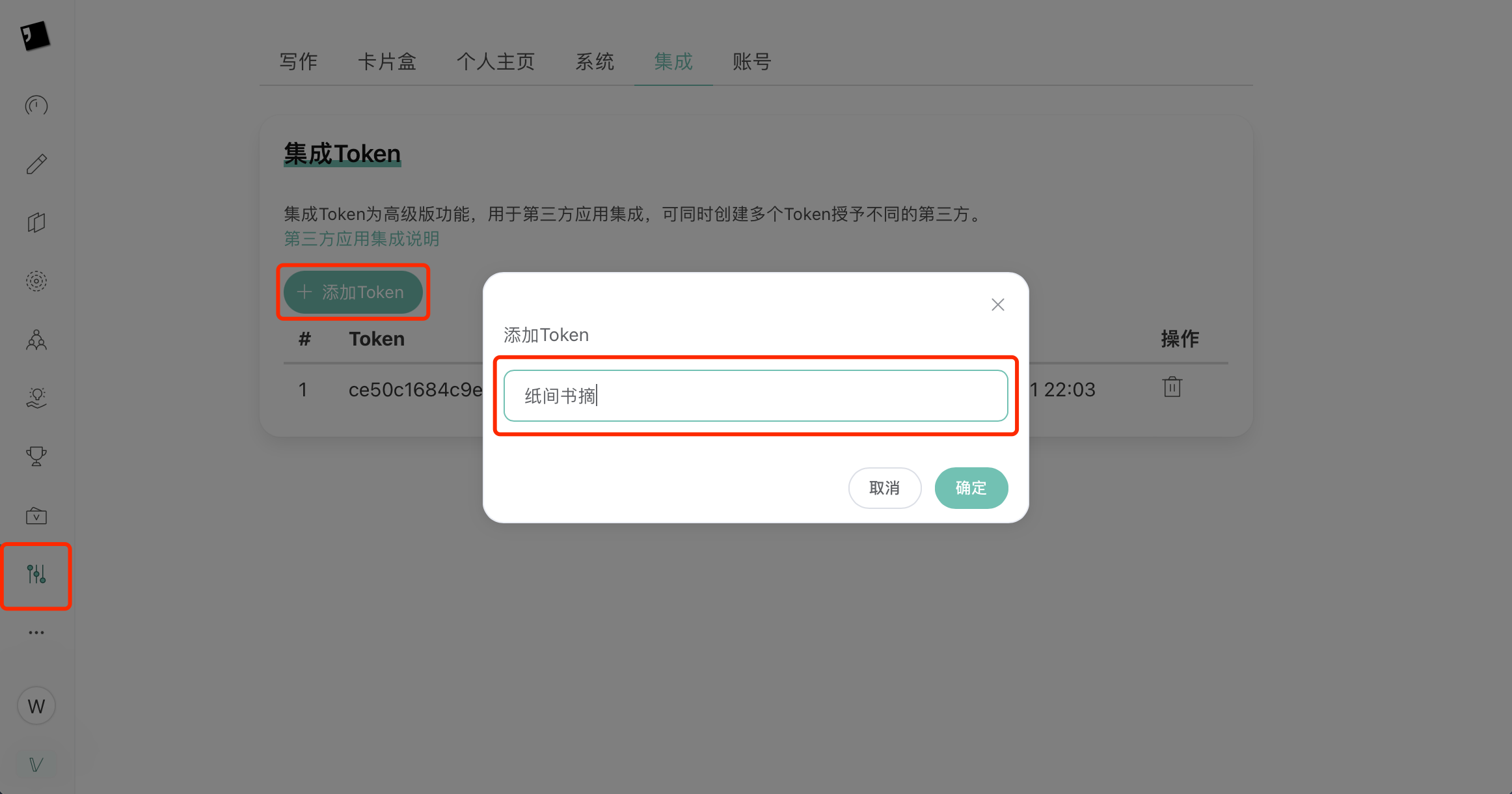 2. 点击「添加Token」，在弹出的输入框中输入描述信息，如「纸间书摘」。输入完成后点击「确定」。