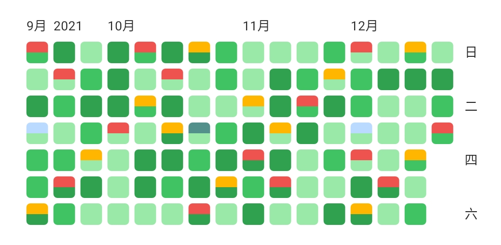 我们将上图中由许多小方格组成的图表称之为热力图,它与豆瓣中书影音记录的图表非常相似。无论是你记录的每一条笔记,还是统计的读书时长,标记的书籍状态,都可以点亮用于每一天记录的小格子。笔记记录越多,读书时长越长,格子颜色就越深。