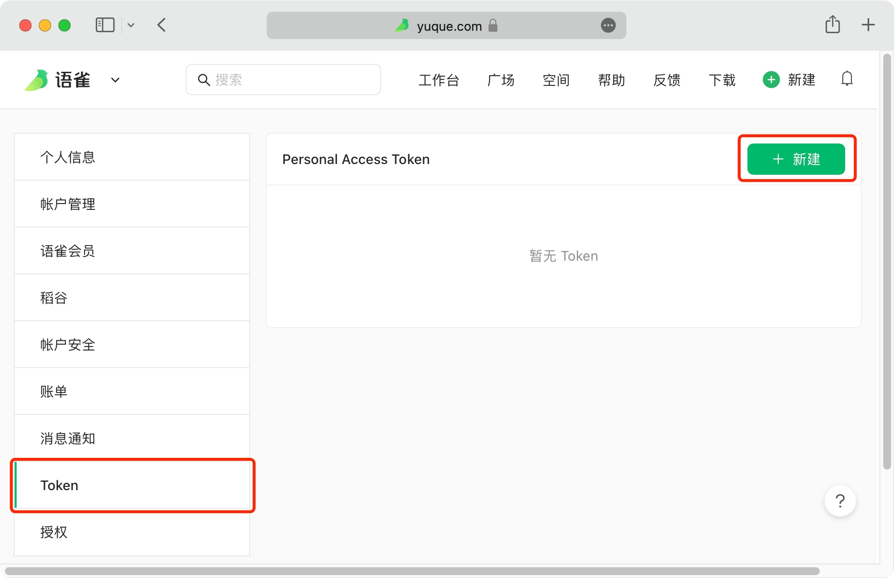2. 点击设置页面左侧菜单中的 Token,再点击页面右上角的新建按钮