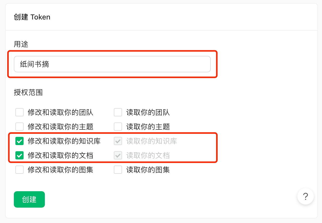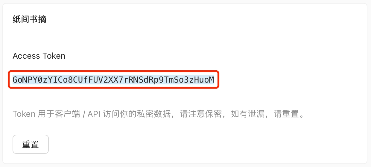 4. 创建完成后,复制 Access Token 填写到纸间书摘即可