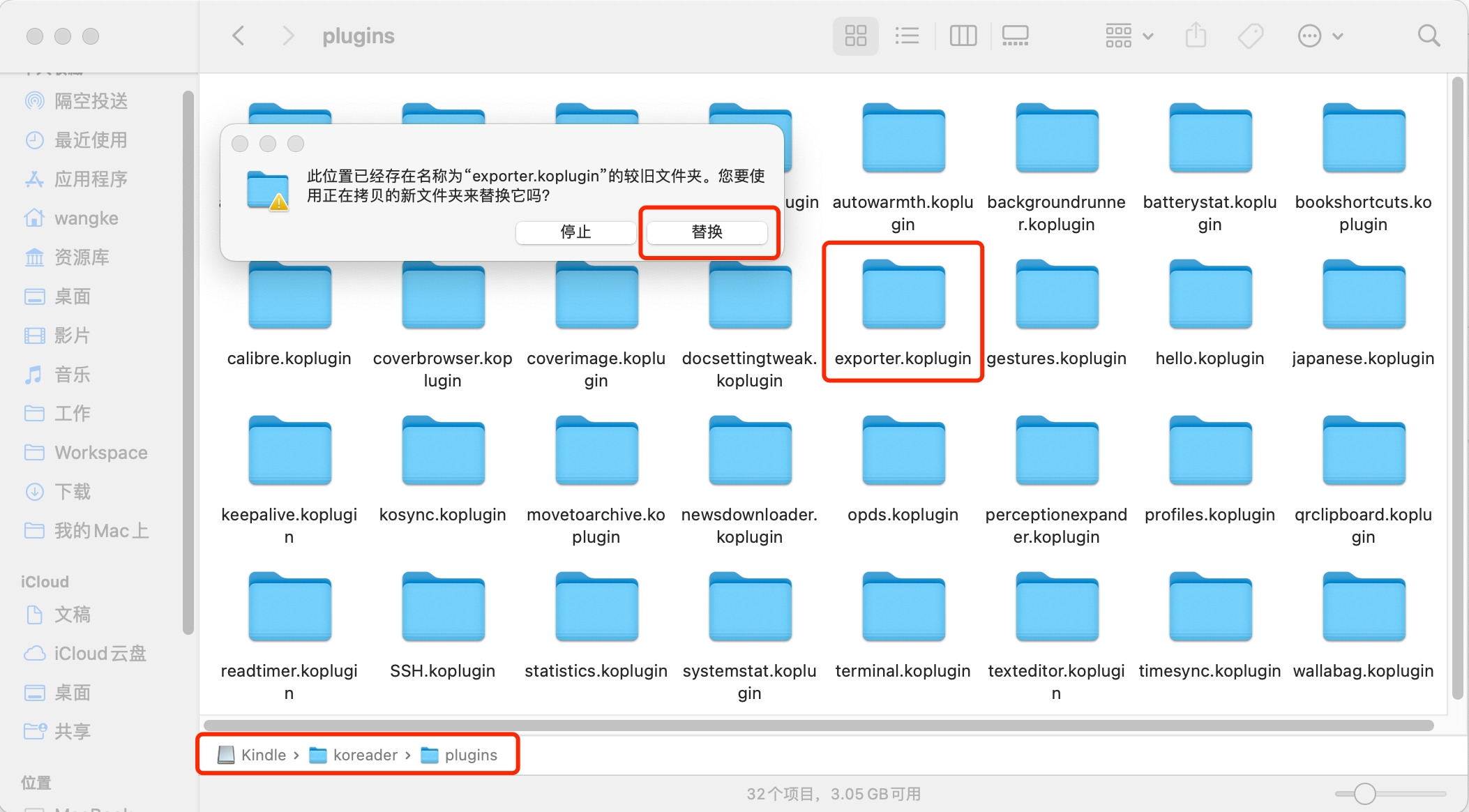 3.将 exporter.koplugin 文件夹拷贝到 /Kindle(根目录)/koreader/plugins 文件夹中即可。