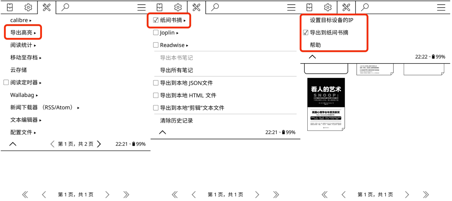 4.再次打开 KOReader 后您将会在「导出高亮」中看到「纸间书摘」的操作项。